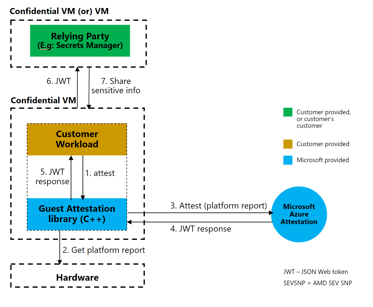 - Ensure that a relying party is presented evidence that a Confidential VM is running on a confidential hardware platform and in a good state to engage with for making sensitive transactions.
